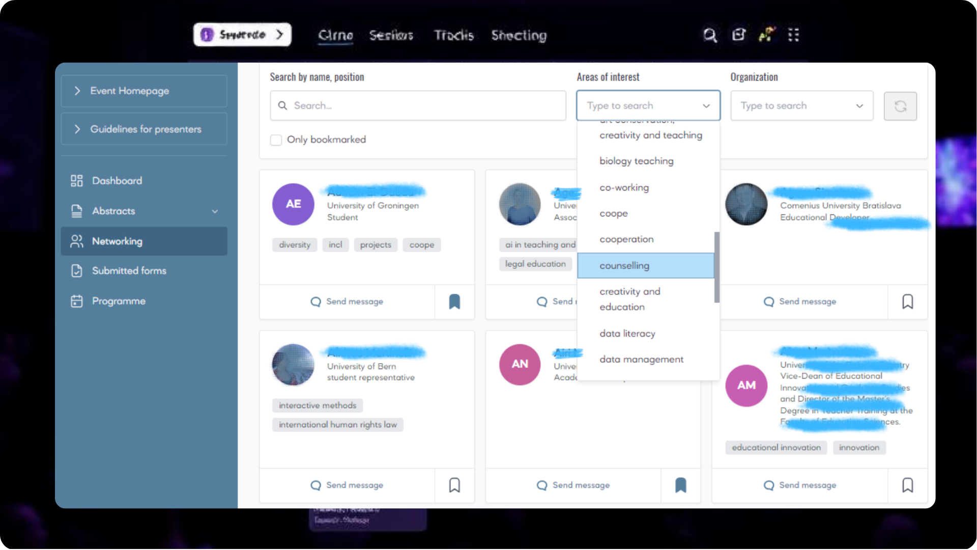 От начала и до конца наша динамическая программа - это информационный центр вашего мероприятия. Расположенная на целевой странице мероприятия, она является центральной точкой для доступа ко всему контенту мероприятия. Посетители могут легко изучить сессии, информацию об экспонентах, биографии докладчиков и многое другое.